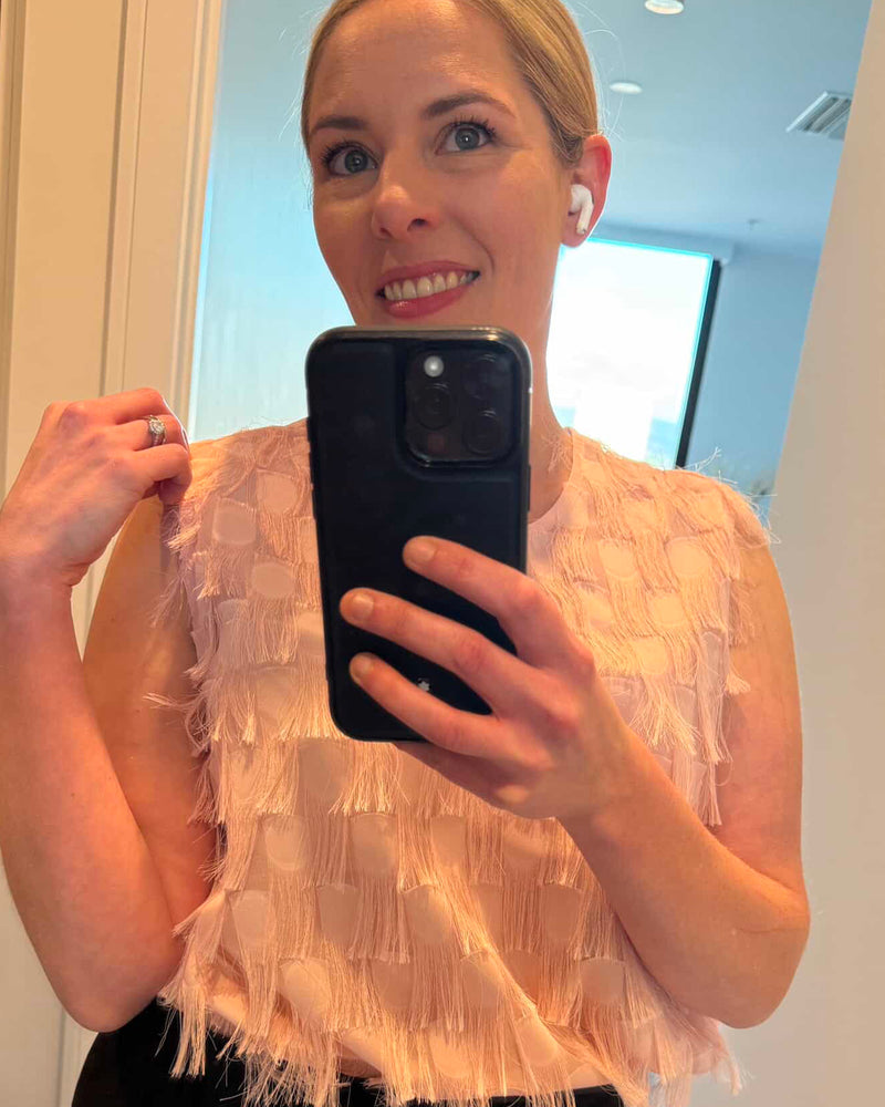 Your blush feather top just arrived and I’m in love! It fits perfectly (a huge “yessss” was uttered when trying it on as I’m on the pocket rocket size side of things) and it’s just so fabulously fun and stylish.