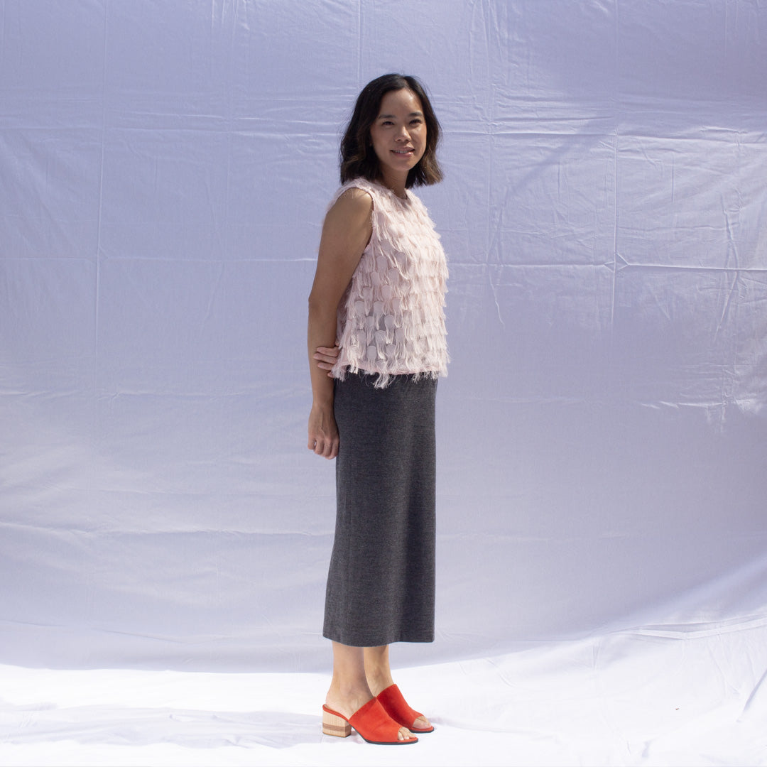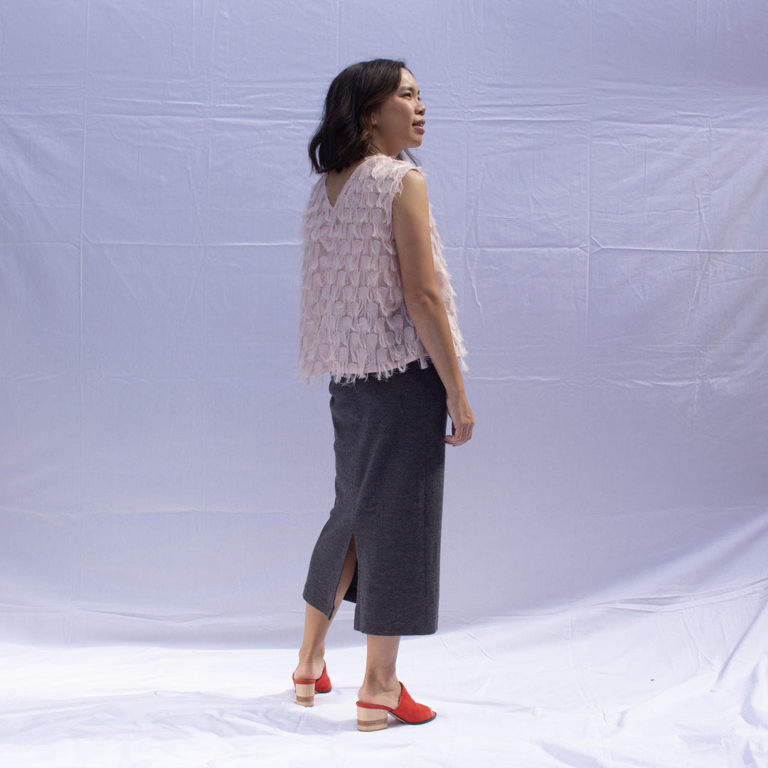 A top to turn heads and add interest to any look. The delicate fabric is slightly transparent, but can certainly be worn on it's own like it is here on founder, Denise or alternatively can be worn with a slip underneath.